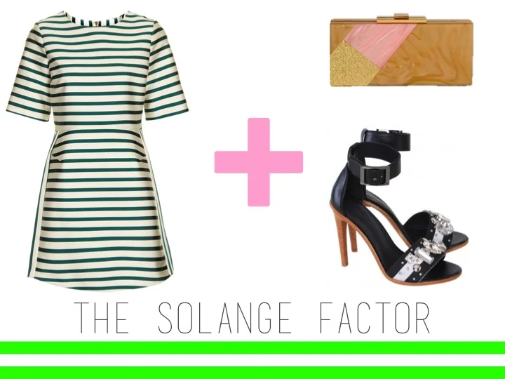 Well, Solange would wear this outfit above fer suuureee. A lime-green and groovy yet niftily nautical dress from Topshop and spectacular statement heels from Tibi adorned with gobstopper gems and monochrome stripes (now on sale for $178 - down from the wince-worthy $445 price-tag so buy it right this very second!!!) have the Solange sass. Add in an Edie Parker-ish clutch and strut around like you learned it from Beyonce... just like Solange did!